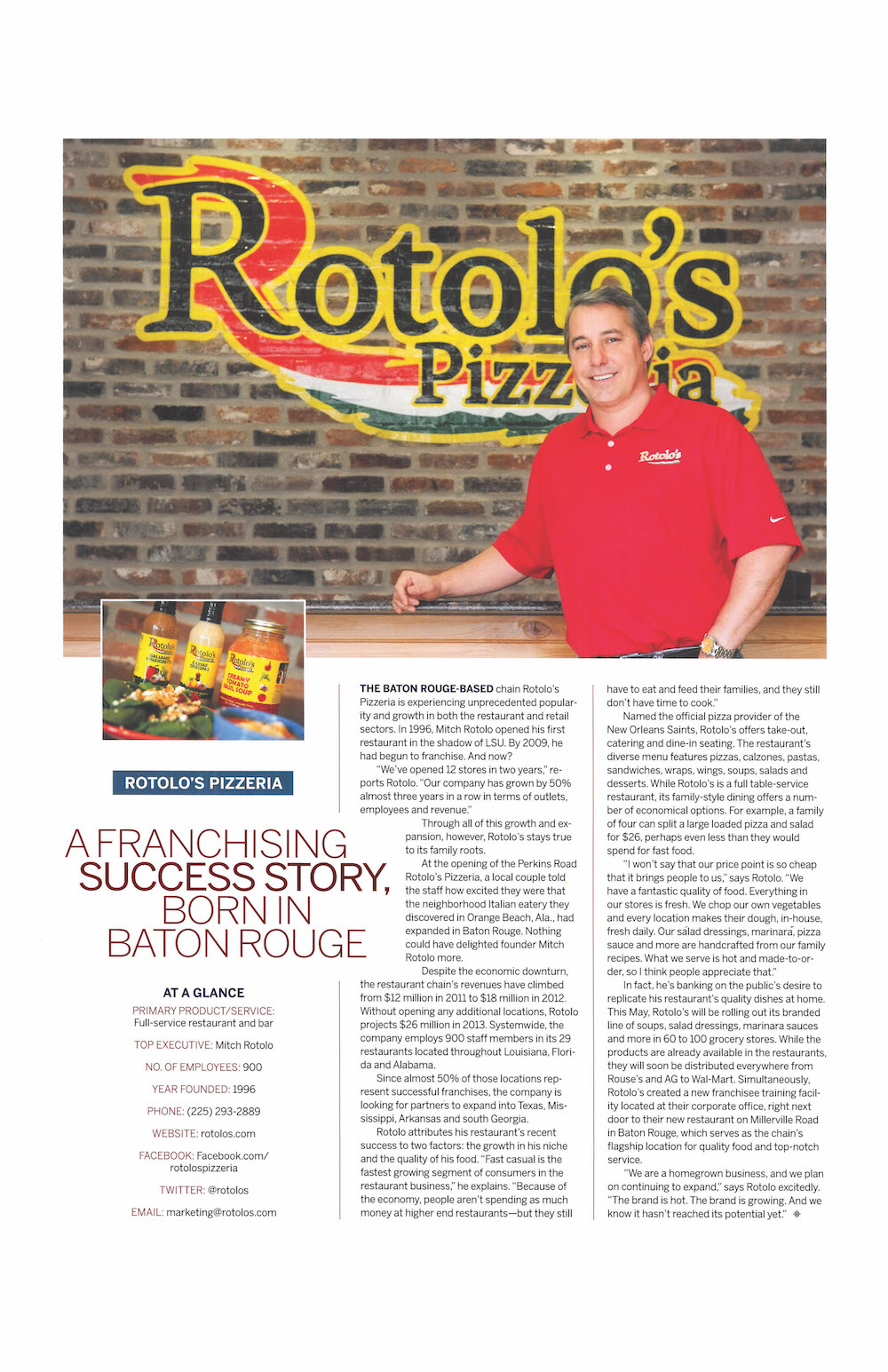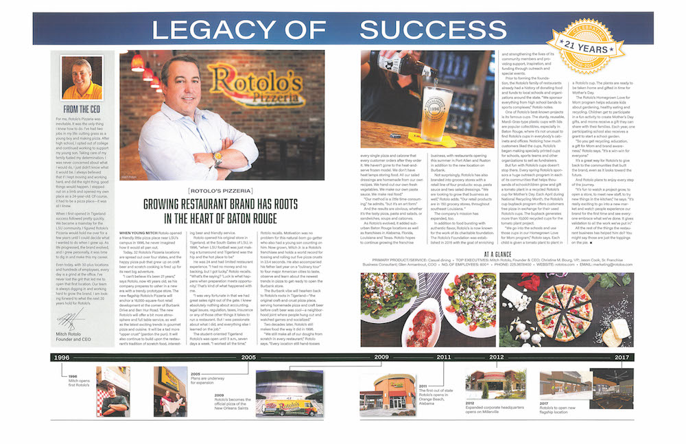 BR Business Report: Legacy of Success – Growing restaurant brand has roots in the heart of Baton Rouge. “I was very fortunate in that we had great sales right out of the gate. I knew absolutely nothing about accounting, legal issues, regulation, taxes, insurance or any of those other things it takes to run a restaurant. But I was passionate about what I did, and everything else I learned on the job.” – Mitch Rotolo