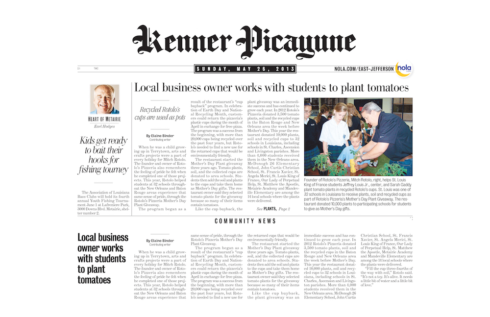 HGL article – Founder of Rotolo’s Pizzeria, Mitch Rotolo, right, helps St. Louis King of France students Jeffrey Louis Jr., center, and Sarah Gaddy plant tomato plants in recycled Rotolo’s cups. St. Louis was one of 32 schools in Louisiana to receive plants, soil and recycled cups as part of Rotolo’s Pizzeria’s Mother’s Day Plant Giveaway. The restaurant donated 10,000 plants to participating schools for students to give as Mother’s Day gifts.