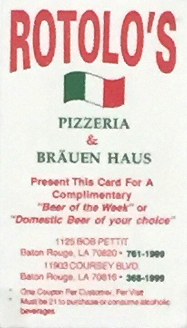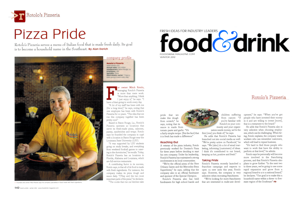 In 1996, Mitch Rotolo opened the first Rotolo’s Pizzeria in Baton Rouge, Louisiana just a pizza throw away from Louisiana State University. Through the will and loyalty of Rotolo’s customers, the casual Italian restaurant has since grown into a successful franchise with locations across the south and many more in the works! Rotolo’s is proud to continue to live up to its long-standing reputation for providing fresh ingredients and friendly service, because that’s just the way we Rotolo!
