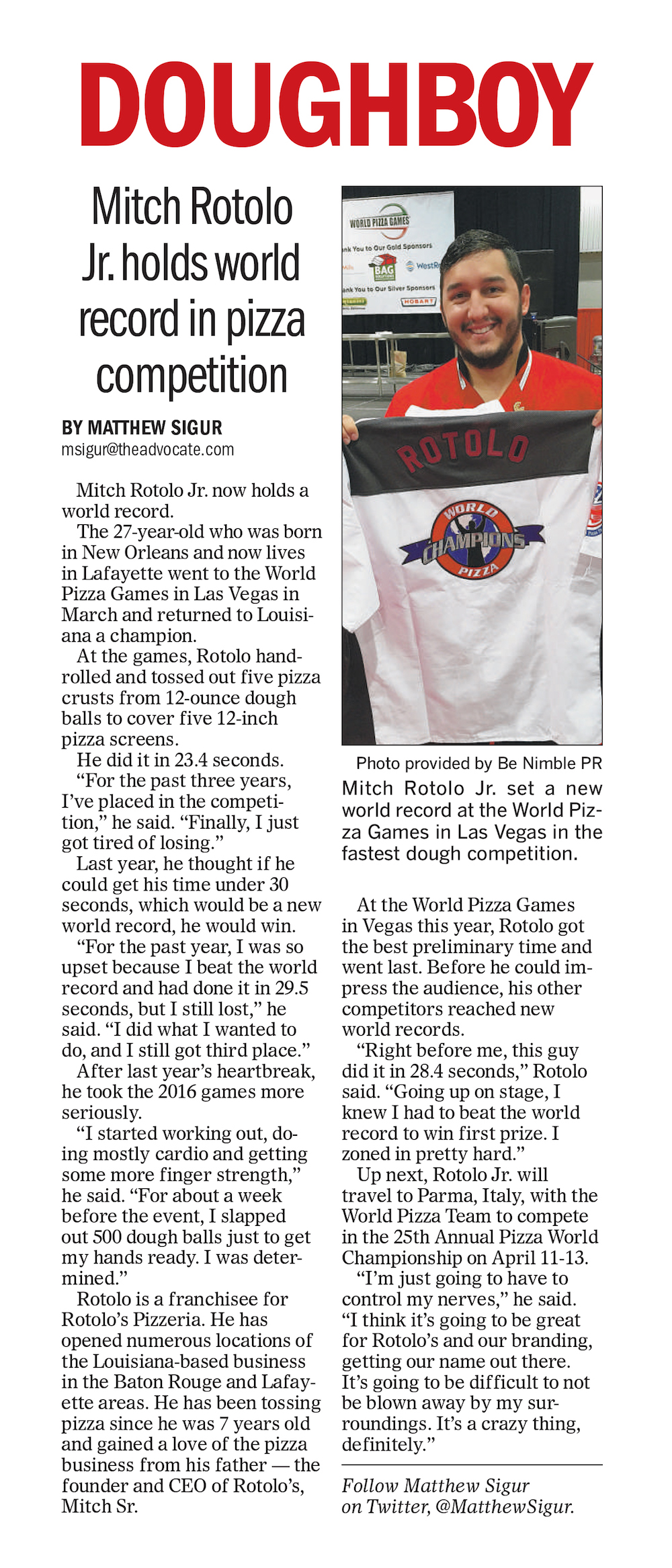 Mitch Jr. World Pizza Games Dough Boy article – Mitch Rotolo Jr. set a new world record at the World Pizza Games in Las Vegas in the fastest dough competition.