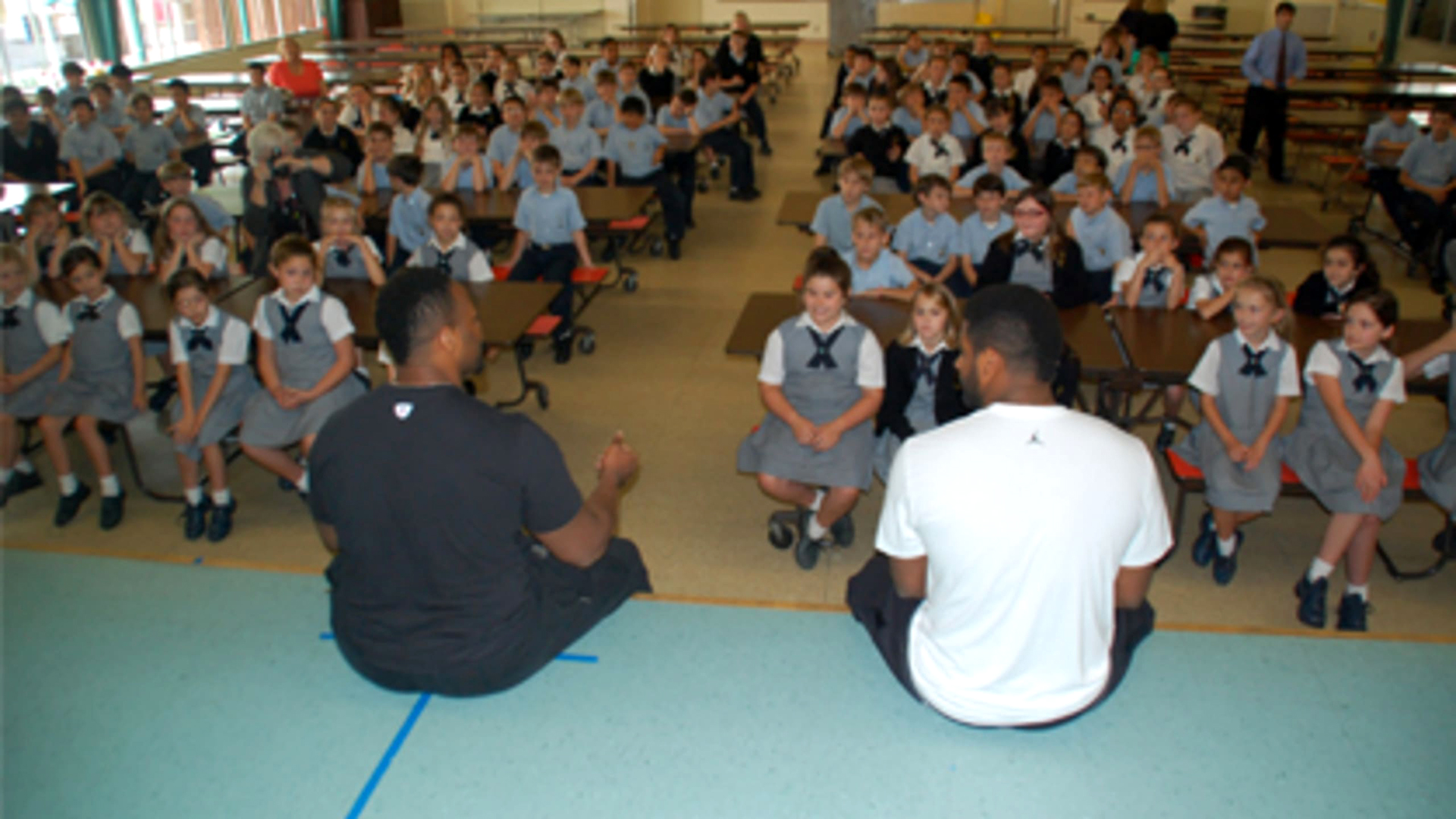 Rotolo’s Pizzeria, the official pizza of the New Orleans Saints, surprised students of St. Edward the Confessor School in Metairie on Wednesday, Apr. 17, with an afternoon visit by defensive end Cameron Jordan and defensive tackle Akiem Hicks. The players teamed up with Rotolo’s to stress the importance of reading through the Roloto’s Literacy Program.